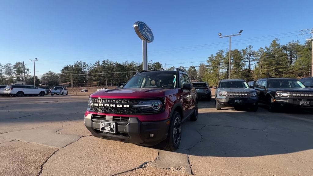 Ruby Red Metallic Tinted Clearcoat 2025 Ford Bronco Sport Outer Banks 4WD 8-Speed Automatic 1.5L EcoBoost 4-Wheel Disc Brakes, 6 Speakers, ABS brakes, Air Conditioning, Alloy wheels, AM/FM radio: SiriusXM, AM/FM Stereo, Auto High-beam Headlights, Auto-dimming Rear-View mirror, Automatic temperature control, Brake assist, Compass, Delay-off headlights, Driver door bin, Driver vanity mirror, Dual front impact airbags, Dual front side impact airbags, Electronic Stability Control, Emergency communication system: SYNC 4 911 Assist, Four wheel independent suspension, Front anti-roll bar, Front Bucket Seats, Front Center Armrest, Front Driver/Passenger Seat Back Map Pockets, Front dual zone A/C, Front fog lights, Front reading lights, Fully automatic headlights, Garage door transmitter, Heated door mirrors, Heated front seats, Heated steering wheel, Illuminated entry, Knee airbag, Low tire pressure warning, Memory seat, Occupant sensing airbag, Outside temperature display, Overhead airbag, Overhead console, Panic alarm, Passenger door bin, Passenger vanity mirror, Power door mirrors, Power driver seat, Power passenger seat, Power steering, Power windows, Premium Trimmed Front Bucket Seats w/Ebony/Roast, Radio data system, Rain sensing wipers, Rear anti-roll bar, Rear Parking Sensors, Rear reading lights, Rear seat center armrest, Rear window defroster, Rear window wiper, Remote keyless entry, Security system, SiriusXM, Speed control, Speed-sensing steering, Speed-Sensitive Wipers, Split folding rear seat, Steering wheel mounted audio controls, SYNC 4 w/Enhanced Voice Recognition, Tachometer, Telescoping steering wheel, Tilt steering wheel, Traction control, Trip computer, Variably intermittent wipers, Wheels: 18" Ebony Black-Painted Aluminum.
