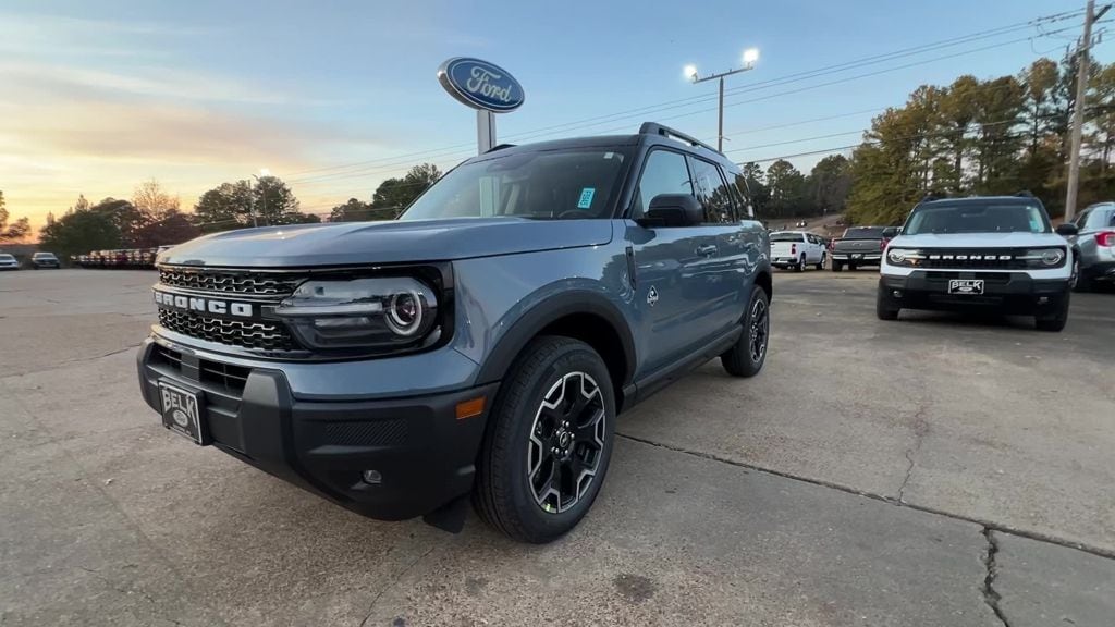 Azure Gray Metallic Tri-Coat 2025 Ford Bronco Sport Outer Banks 4WD 8-Speed Automatic 1.5L EcoBoost 4-Wheel Disc Brakes, 6 Speakers, ABS brakes, Air Conditioning, Alloy wheels, AM/FM radio: SiriusXM, AM/FM Stereo, Auto High-beam Headlights, Auto-dimming Rear-View mirror, Automatic temperature control, Brake assist, Compass, Delay-off headlights, Driver door bin, Driver vanity mirror, Dual front impact airbags, Dual front side impact airbags, Electronic Stability Control, Emergency communication system: SYNC 4 911 Assist, Four wheel independent suspension, Front anti-roll bar, Front Bucket Seats, Front Center Armrest, Front Driver/Passenger Seat Back Map Pockets, Front dual zone A/C, Front fog lights, Front reading lights, Fully automatic headlights, Garage door transmitter, Heated door mirrors, Heated front seats, Heated steering wheel, Illuminated entry, Knee airbag, Low tire pressure warning, Memory seat, Occupant sensing airbag, Outside temperature display, Overhead airbag, Overhead console, Panic alarm, Passenger door bin, Passenger vanity mirror, Power door mirrors, Power driver seat, Power passenger seat, Power steering, Power windows, Premium Trimmed Front Bucket Seats w/Ebony/Roast, Radio data system, Rain sensing wipers, Rear anti-roll bar, Rear Parking Sensors, Rear reading lights, Rear seat center armrest, Rear window defroster, Rear window wiper, Remote keyless entry, Security system, SiriusXM, Speed control, Speed-sensing steering, Speed-Sensitive Wipers, Split folding rear seat, Steering wheel mounted audio controls, SYNC 4 w/Enhanced Voice Recognition, Tachometer, Telescoping steering wheel, Tilt steering wheel, Traction control, Trip computer, Variably intermittent wipers, Wheels: 18" Ebony Black-Painted Aluminum.