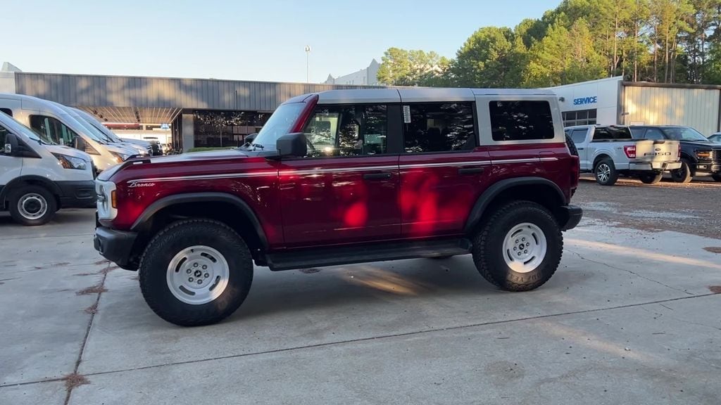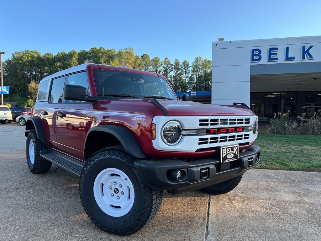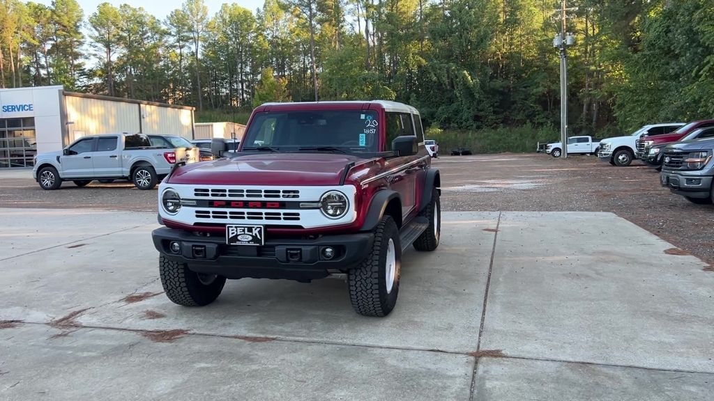 Ruby Red Metallic Tinted Clearcoat 2025 Ford Bronco Heritage Edition 4WD 10-Speed Automatic 2.7L EcoBoost V6 4-Wheel Disc Brakes, 7 Speakers, ABS brakes, Air Conditioning, Alloy wheels, AM/FM radio: SiriusXM with 360L, AM/FM Stereo, Auto High-beam Headlights, Auto-dimming Rear-View mirror, Automatic temperature control, Brake assist, Compass, Connected Navigation, Convertible HardTop, Convertible roof lining, Delay-off headlights, Driver door bin, Driver vanity mirror, Dual front impact airbags, Dual front side impact airbags, Electronic Stability Control, Emergency communication system: 911 Assist, Exterior Parking Camera Rear, Front anti-roll bar, Front Bucket Seats, Front Center Armrest, Front dual zone A/C, Front fog lights, Front reading lights, Front wheel independent suspension, Fully automatic headlights, Glass rear window, Heated door mirrors, Heated front seats, Heated steering wheel, Illuminated entry, Integrated roll-over protection, Leather Shift Knob, Low tire pressure warning, Navigation system: Connected Navigation, Occupant sensing airbag, Outside temperature display, Overhead airbag, Overhead console, Panic alarm, Passenger door bin, Passenger vanity mirror, Plaid Cloth Front Heated Bucket Seats, Power door mirrors, Power steering, Power windows, Radio data system, Rear window defroster, Rear window wiper, Remote keyless entry, Security system, SiriusXM w/360L, Speed control, Split folding rear seat, Steering wheel mounted audio controls, SYNC 4, Tachometer, Telescoping steering wheel, Tilt steering wheel, Traction control, Trip computer, Variably intermittent wipers, Wheels: 17" Unique White.