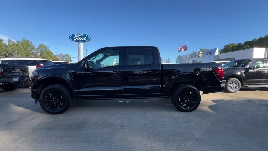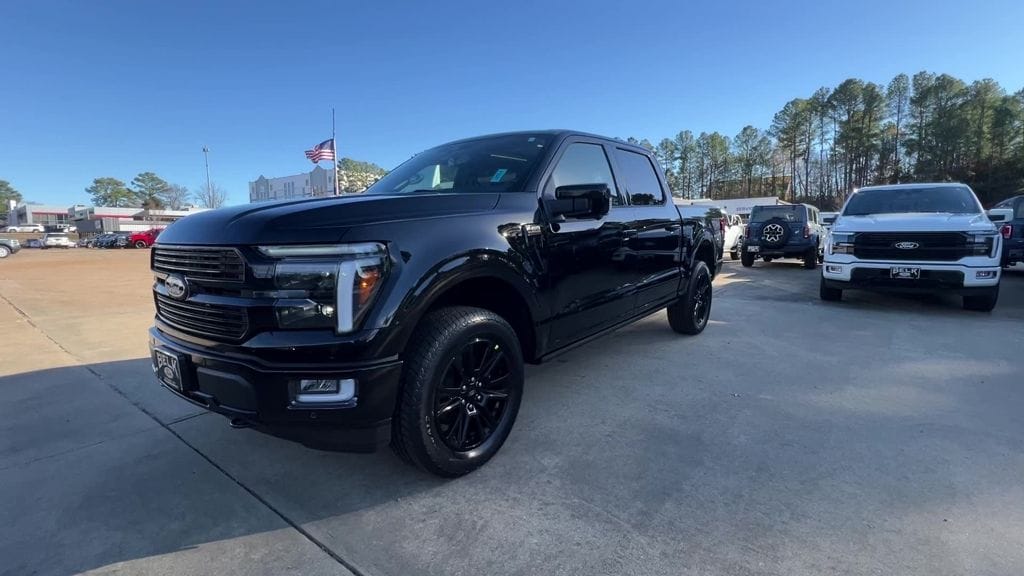 Agate Black Metallic 2025 Ford F-150 Platinum 4WD 10-Speed Automatic 3.5L V6 EcoBoost 4WD, 4-Wheel Disc Brakes, 8 Speakers, ABS brakes, Adjustable pedals, Air Conditioning, Alloy wheels, AM/FM radio: SiriusXM with 360L, Auto High-beam Headlights, Auto tilt-away steering wheel, Auto-dimming door mirrors, Auto-dimming Rear-View mirror, Automatic temperature control, Brake assist, Bumpers: body-color, Compass, Delay-off headlights, Driver door bin, Driver vanity mirror, Dual front impact airbags, Dual front side impact airbags, Electronic Locking w/3.55 Axle Ratio, Electronic Stability Control, Emergency communication system: SYNC 4 911 Assist, Front anti-roll bar, Front Bucket Seats, Front Center Armrest, Front dual zone A/C, Front fog lights, Front reading lights, Front wheel independent suspension, Fully automatic headlights, Garage door transmitter, Heated door mirrors, Heated front seats, Heated rear seats, Heated steering wheel, Illuminated entry, Internet access capable: FordPass Connect 5G, Leather steering wheel, Low tire pressure warning, Memory seat, Navigation system: Connected Navigation, Occupant sensing airbag, Outside temperature display, Overhead airbag, Overhead console, Panic alarm, Passenger door bin, Passenger vanity mirror, Pedal memory, Power door mirrors, Power driver seat, Power passenger seat, Power steering, Power windows, Radio data system, Radio: B&O Sound System by Bang & Olufsen, Rain sensing wipers, Rear reading lights, Rear seat center armrest, Rear step bumper, Rear window defroster, Remote keyless entry, Security system, Speed control, Split folding rear seat, Steering wheel memory, Steering wheel mounted audio controls, SYNC 4 w/Enhanced Voice Recognition, Tachometer, Telescoping steering wheel, Tilt steering wheel, Traction control, Trip computer, Turn signal indicator mirrors, Unique Multi-Contour Leather Bucket Seats, Variably intermittent wipers, Ventilated front seats, Voltmeter, Wheels: 20" Painted Gloss Ebony Black, 4WD.