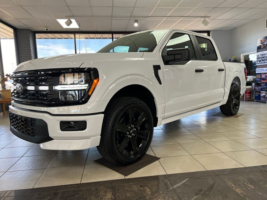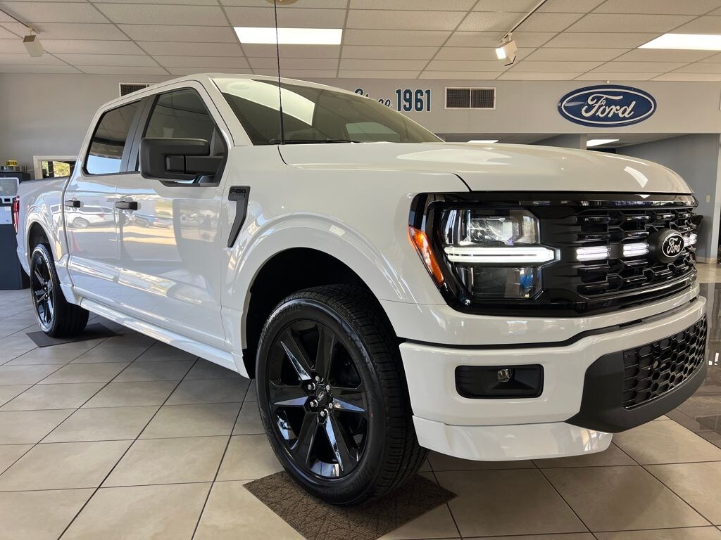 White 2026 Ford F-150 STX 4WD 10-Speed Automatic 5.0L V8 4WD, 3.55 Axle Ratio, 4-Wheel Disc Brakes, 6 Speakers, ABS brakes, Air Conditioning, Alloy wheels, AM/FM radio: SiriusXM with 360L, Auto High-beam Headlights, Brake assist, Bumpers: body-color, Compass, Delay-off headlights, Driver door bin, Dual front impact airbags, Dual front side impact airbags, Electronic Stability Control, Emergency communication system: SYNC 4 911 Assist, Ford Connectivity Package (1-Year Included), Front anti-roll bar, Front Bucket Seats, Front Center Armrest, Front reading lights, Front wheel independent suspension, Fully automatic headlights, GVWR: 6,650 lbs Payload Package, Heated door mirrors, Illuminated entry, Internet access capable: 5G Modem - Ford Connectivity Package, Low tire pressure warning, Occupant sensing airbag, Outside temperature display, Overhead airbag, Overhead console, Panic alarm, Passenger door bin, Passenger vanity mirror, Power door mirrors, Power steering, Power windows, Radio data system, Radio: AM/FM Stereo with SiriusXM 360L, Rear step bumper, Rear window defroster, Remote keyless entry, Security system, Speed control, Split folding rear seat, Steering wheel mounted audio controls, SYNC 4 with Enhanced Voice Recognition, Tachometer, Telescoping steering wheel, Tilt steering wheel, Traction control, Trip computer, Unique Sport Cloth 40/Console/40 Front-Seats, Variably intermittent wipers, Wheels: 18" Gloss Black, 4WD.